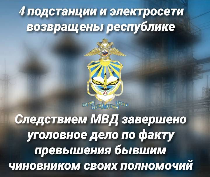 4 подстанции и электросети возвращены республике. Следствием МВД завершено уголовное дело по факту превышения бывшим чиновником своих полномочий