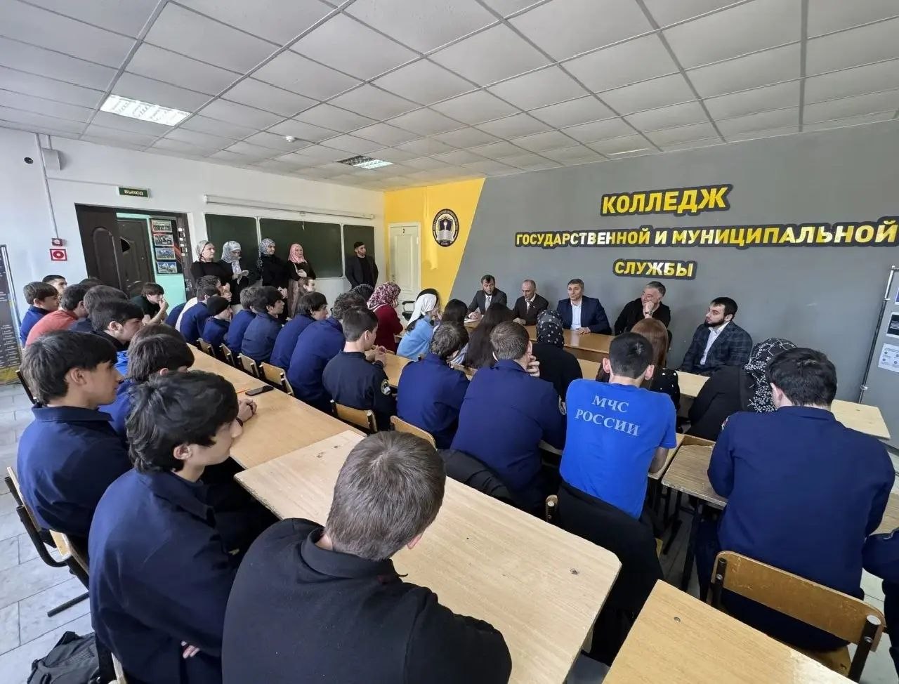 Встреча прошла в колледже государственной и муниципальной службы. От администрации пришли замы главы Азраил Джандигов и Тимур Евлоев, а также депутаты, почётные граждане и председатель молодёжного совета.