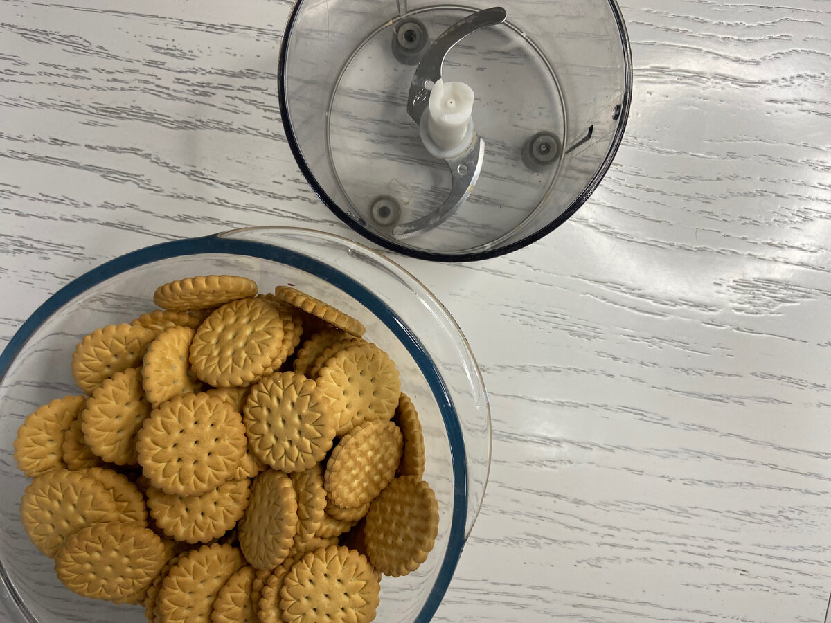 Процесс готовки не займет много времени. Начните с того, что измельчите печенье — можно это сделать в блендере или с помощью скалки, но не перетирайте в порошок, чтобы кусочки смотрелись привлекательно в готовом рулете.