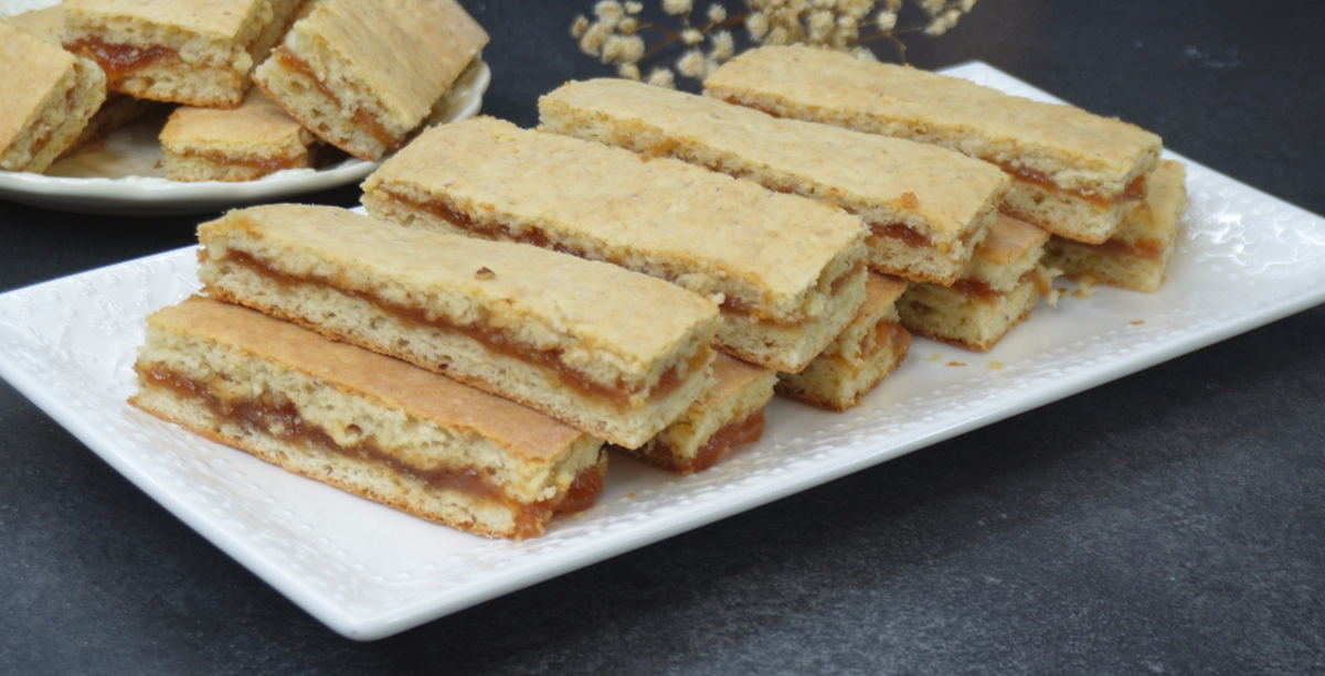 После охлаждения разделить тесто на две равные части. Раскатать одну из них в пласт размером примерно 22 на 30 см и выложить на противень. Намазать вареньем (по желанию можно использовать джем), оставляя немного свободного края. Для начинки потребуется около 250 г варенья.