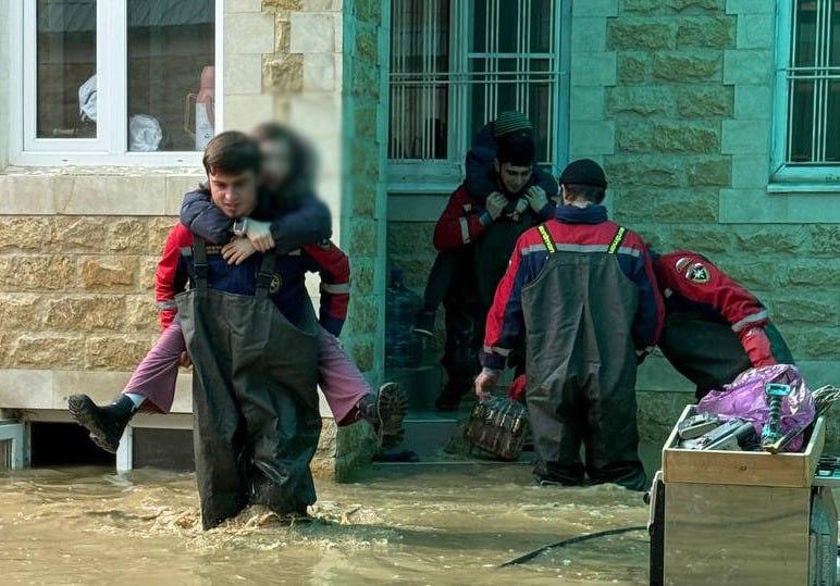 Они откачивали воду из подвалов и с первых этажей домов в квартале Пальмира в Махачкале, эвакуировали людей на лодках, спасали выживших животных.