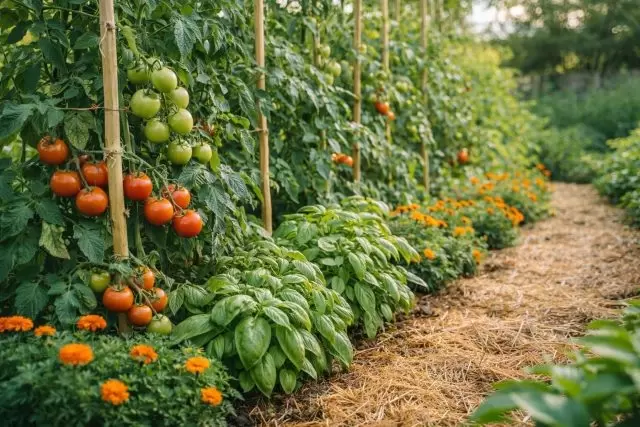 Некоторые пряные травы и цветы станут ценными защитниками: например, мята отпугивает тлю, а томаты защищают компаньонов от других вредителей.
