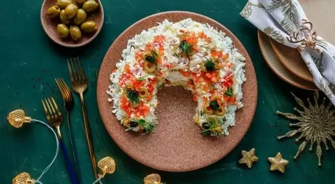 - «Гранатовый браслет» — с языком и свеклой, который будет выглядеть роскошно и подойдёт для любого праздника.