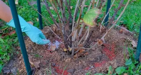 - Применение: необходимо рассыпать стакан извести вокруг куста с отступом от ствола, затем слегка заделать и полить.