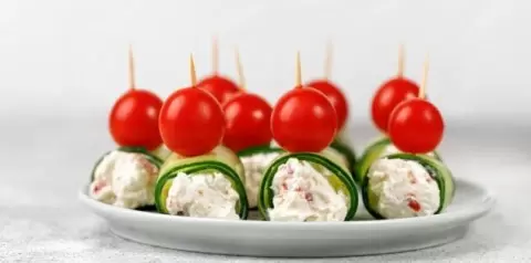 Эта закуска также привлекает своей пользой и лёгкостью. Хрустящий огурец добавляет свежесть, помидоры черри радуют сладостью, а сыр придает кремовую текстуру. Варианты сыра могут быть разнообразными: от сливочного до брынзы или пикантного голубого сыра, что позволяет экспериментировать с вкусами. Все ингредиенты гармонично дополняют друг друга, что открывает возможности для создания всевозможных вариаций этого блюда.