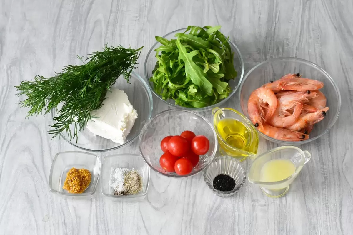 Нарезка ингредиентов и сборка салата займут не больше 35 минут. Все овощи, такие как руккола и томаты, лучше тщательно мыть и сушить, чтобы они были свежими и хрустящими. Креветки рекомендуется отваривать в подсоленной воде около трех минут и остудить перед использованием. Творожный сыр можно обвалять в измельченном укропе, добавив немного ярких акцентов в качестве украшения.