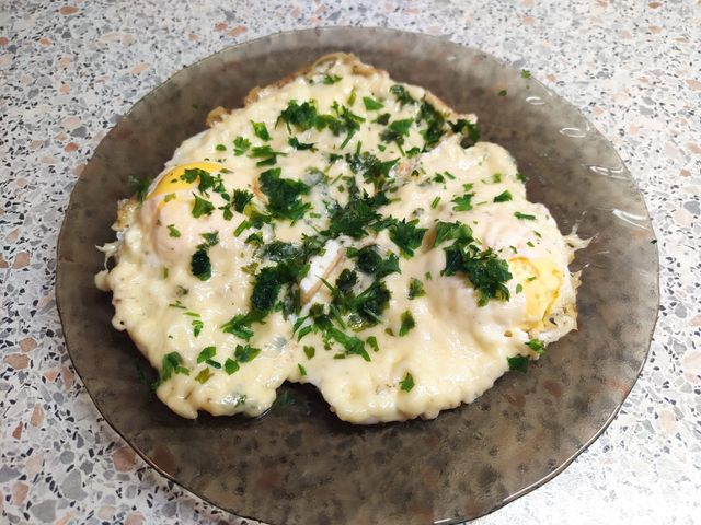 - Яичница из двух яиц с помидорами и кусочком цельнозернового хлеба с маслом.