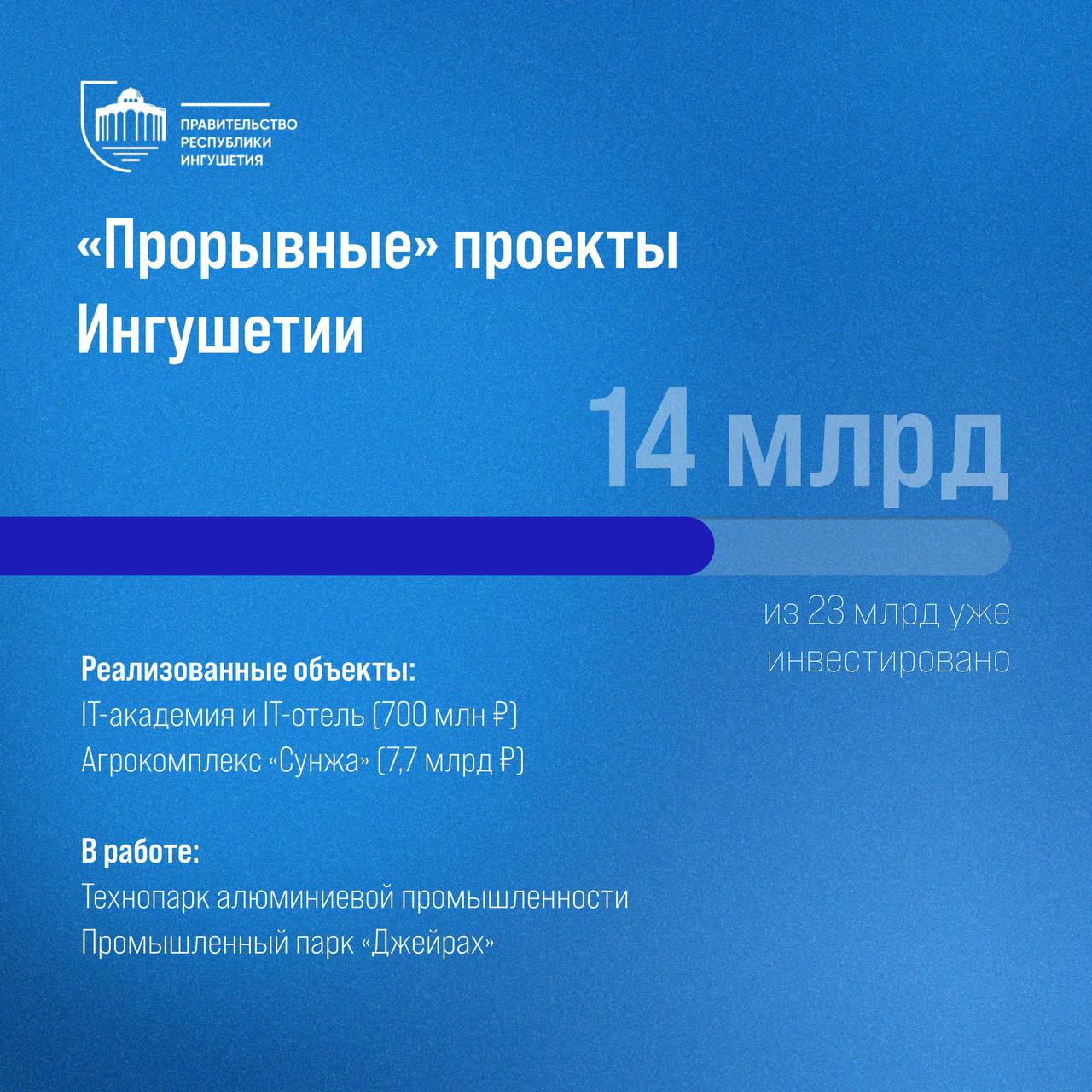 В числе уже реализованных и введенных объектов — IT-академия, IT-отель общей стоимостью 700 млн рублей и тепличный комплекс «Сунжа» стоимостью 7,7 млрд рублей. Продолжается работа по созданию технопарка алюминиевой промышленности, промышленного парка «Джейрах».